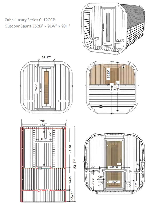 Experience ultimate outdoor relaxation with the SaunaLife Model CL12GCP Cube-Series Sauna Suite. Designed for up to 8 people, this all-in-one luxury sauna retreat features a spacious sauna room with a panoramic tempered-glass window, a separate dressing area, and a cozy front porch for unwinding before and after your session. Built with ultra-durable Thermo-Spruce and crafted in Northern Europe, the CL12GCP offers superior airflow, comfort, and weather resistance — perfect for cabins, large properties, or wellness enthusiasts seeking a top-tier sauna experience.